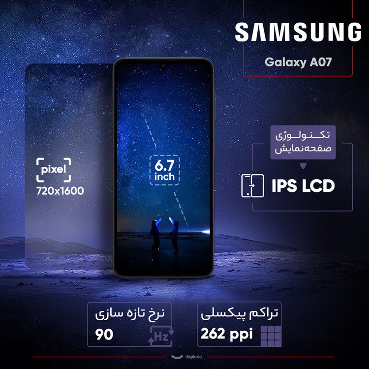 گوشی سامسونگ Galaxy A07 بازیگر جدید سامسونگ در بازار گوشیهای اقتصادی است که تلاش میکند امکانات زیادی را در بازه قیمتی پایین ارائه دهد. این گوشی به پردازنده مدیاتک Helio G99 مجهز است و تجربهای روان در اجرای برنامههای روزمره و بازيهای سبک فراهم میکند. صفحه نمایش ۶.۷ اینچی از نوع LCD با وضوح HD+ و نرخ نوسازی ۹۰ هرتز تعادل خوبی میان وضوح تصویر و مصرف انرژی ارائه میدهد و در عین حال حرکت بین منوها و صفحات مختلف را نرمتر جلوه میدهد. در بخش دوربین، Galaxy A07 یک ترکیب دوگانه ارائه میدهد. دوربین اصلی ۵۰ مگاپیکسلی با دیافراگم f/1.8 توانایی ثبت تصاویر واضح در شرایط نوری مناسب را دارد و دوربین دوم ۲ مگاپیکسلی نیز از نوع عمقسنج است. برای دوربین سلفی در این مدل، سامسونگ از یک سنسور ۸ مگاپیکسلی استفاده کرده است. باتری بزرگ ۵۰۰۰ میلی آمپر ساعتی این دستگاه نشان دهنده دوام بالای باتری در استفاده روزانه است و با پشتیبانی از شارژ سریع ۲۵ واتی، زمان مورد نیاز برای شارژ دستگاه را کاهش میدهد. برای بدنه، سامسونگ از ترکیبی سبک و در عین حال مقاوم استفاده کرده است. پوشش پشتی از پلیمر تقویت شده با فیبر شیشه ساخته شده و از استاندارد IP54 نیز پشتیبانی میکند تا گوشی تا حدودی در برابر پاشش آب و گردوغبار مقاوم باشد. این گوشی با سیستم عامل اندروید ۱۵ و با رابط کاربری One UI 7 عرضه شده است و سامسونگ وعده ارتقاء نرم افزاری و امنیتی را برای شش سال داده است. به طور کلی، Galaxy A07 به عنوان گزینهای مقرون به صرفه برای کسانی به شمار میرود که به دنبال تجربهای روان با امکانات مناسباند.